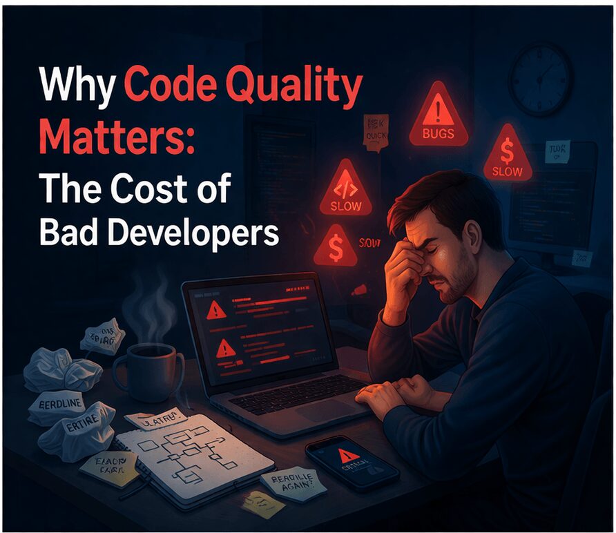 Code quality is the single most important factor in software development. It determines how an application functions and even how a user experiences it. A site, a mobile app, or an intricate enterprise system, none of these would be successful without clean, efficient, and well-organized code. The cost of bad developers, however, can be so high that it consumes a large portion of your project budget. Poorly written code may cause bugs, slow down the app, expose it to security vulnerabilities, or even extend the project’s time. Such issues can grow into a big problem if they are not detected at the initial stage and, therefore, might impact the company’s reputation, team morale, and, in the end, the bottom line.